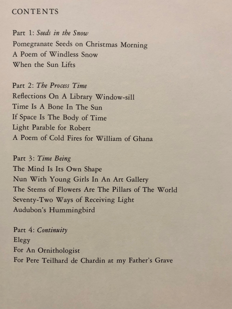 Sister Ellen’s poetry collection is broken into four sections to align with the four distinct seasons in the upper Midwest. One constant throughout all the pieces is the unwavering beauty of nature, even as time continues to alter the natural world and our experience within it. My aunt recently shared with me that Ellen was a “deep thinker” and a “great poet.” It makes me wonder if those two qualities are dependent on each other.